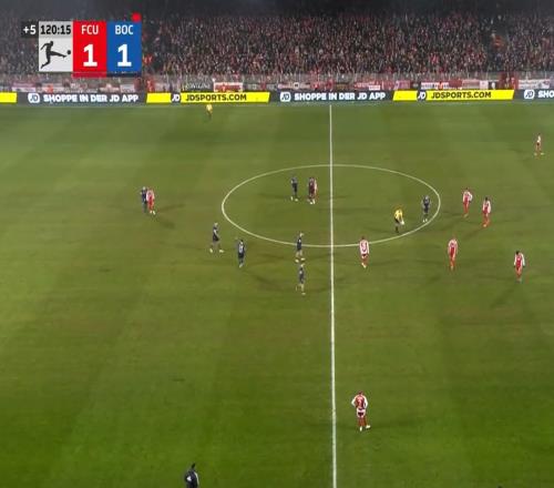 下半场补时第1分钟,波鸿门将德雷维斯被柏林联球迷扔下的打火机砸中,伤退后被送往医院,裁判中断比赛,两队球员返回更衣室。