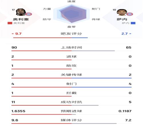 欧冠联赛阶段第6轮,拜仁客场5-1大胜顿涅茨克矿工,奥利塞2球1助当选全场最佳。