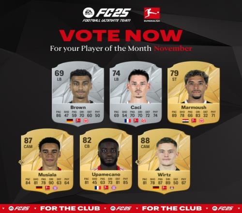 体育资讯12月11日报道宣称 德甲官方11月最佳球员的候选名单出炉,穆西亚拉、维尔茨、于帕梅卡诺在列。
