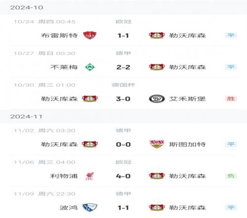 近6场各项赛事,勒沃库森1胜4平1负,仅仅在德国杯比赛中战胜了德乙球队艾禾斯堡。