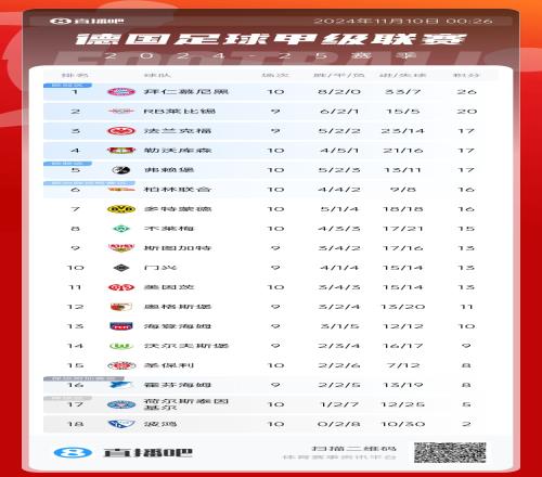 积分榜上,拜仁继续不败领跑,先赛一轮领先莱比锡6分。