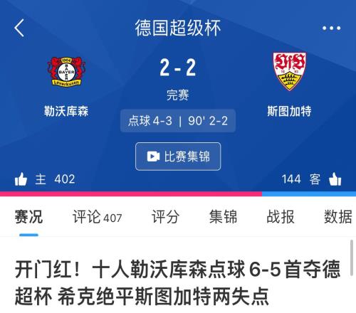 8.18 德超杯希克绝平,勒沃库森2-2平斯图加特直接进入点球,夺得赛季第一冠