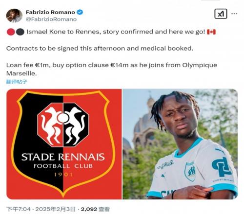 体育资讯2月3日报道宣称 据知名记者罗马诺透露,马赛中场伊斯梅尔-科内租借加盟雷恩,Here we go!