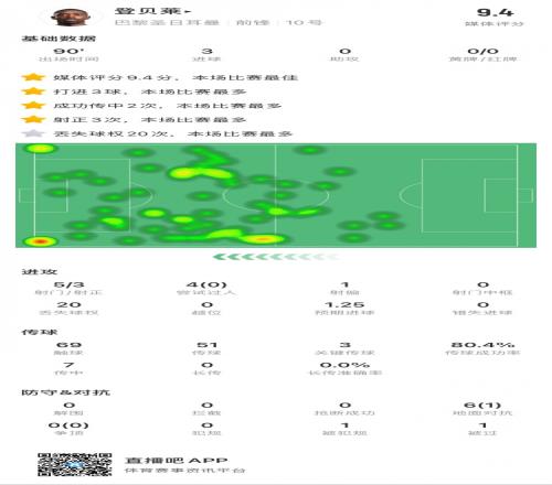 登贝莱本场数据:5次射门打进3球,3次关键传球