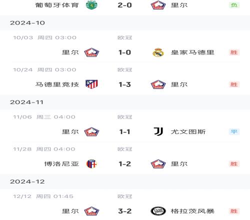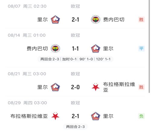 里尔本赛季欧冠从资格赛打起,先后淘汰费内巴切和布拉格斯拉维亚晋级联赛阶段。