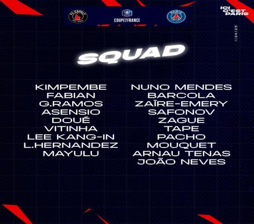 体育资讯1月15日报道宣称 北京时间明天凌晨4点,巴黎将在法国杯32强战中对阵埃斯帕利圣马尔塞,巴黎公布了此役的球员名单。