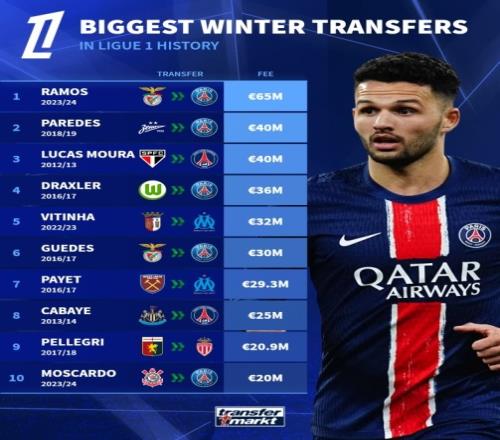 法甲冬窗最贵引援榜:贡萨洛拉莫斯6500万欧居首,巴黎7人上榜