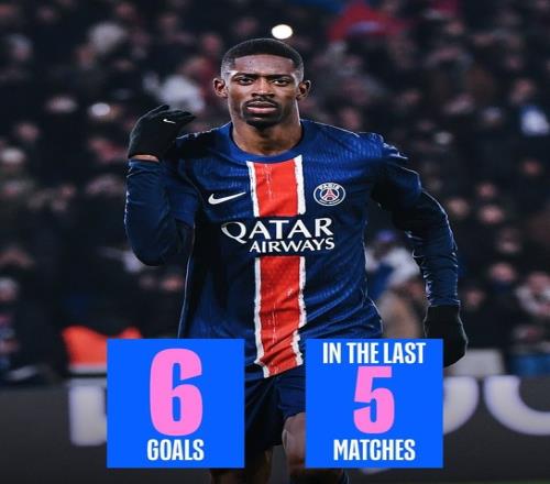 据Kyono GF的数据统计,最近5次代表巴黎圣日耳曼出战的比赛,登贝莱已经打进6粒进球。