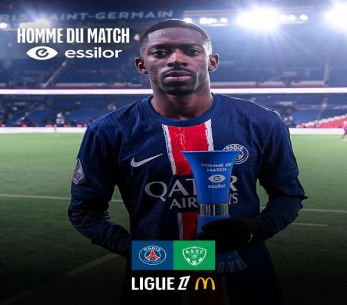 法甲官方社媒晒出登贝莱的领奖照片,宣布他当选本场比赛全场最佳球员。