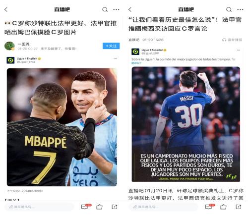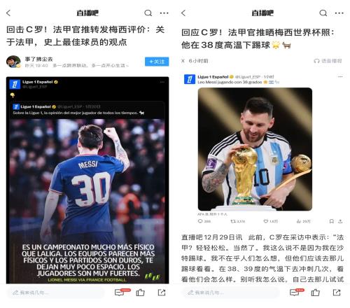 对于C罗这2次言论,法甲官推前后共4次回击,其中英语官推1次、西语官推3次,法甲西语官推3次都是搬出梅西回击C罗。