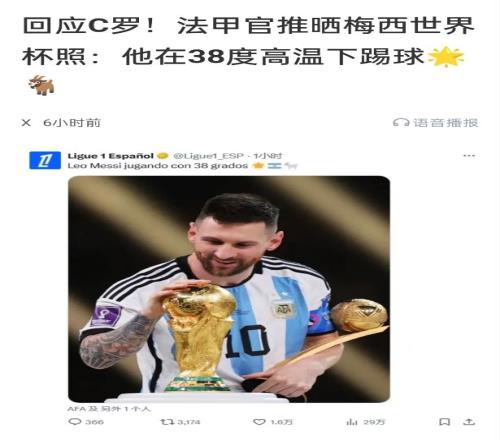 法甲西语官推先后发了2条推特回应C罗,其中第二条推特是晒出梅西赢得2022卡塔尔世界杯的照片,并写道:“梅西在38度高温下踢球