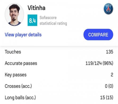 数据统计显示,维蒂尼亚本场触球135次,124次传球、119次成功,成功率高达96%。他还送出2次关键传球。