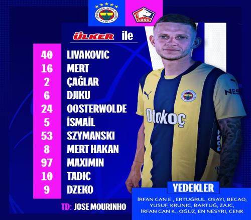 费内巴切首发:40-利瓦科维奇、16-穆尔杜、24-奥斯特沃德、6-德吉库、2-瑟云聚、5-尤克塞克、53-希曼斯基、8-延达斯、10-塔迪奇、97-圣马克西曼、9-哲科