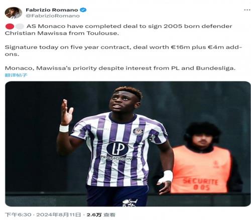 罗马诺:图卢兹19岁中卫马维萨将加盟摩纳哥,转会费总额2000万欧