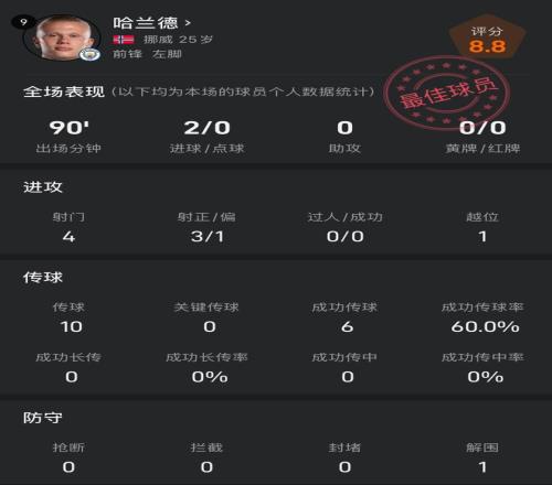 哈兰德本场比赛数据如下