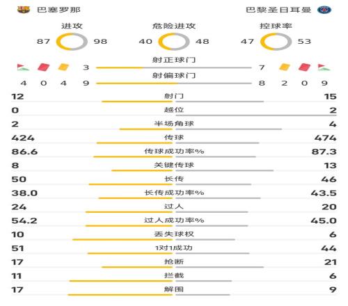 在这场比赛里,大巴黎在射门数上以15-12领先;在射正数上,大巴黎则更是以7-3遥遥领先,达到巴萨的2倍。这样的数据足以说明,大巴黎占据着攻势上的主动权。在控球率方面,大巴黎也以53%-47%占据着优势的地位。