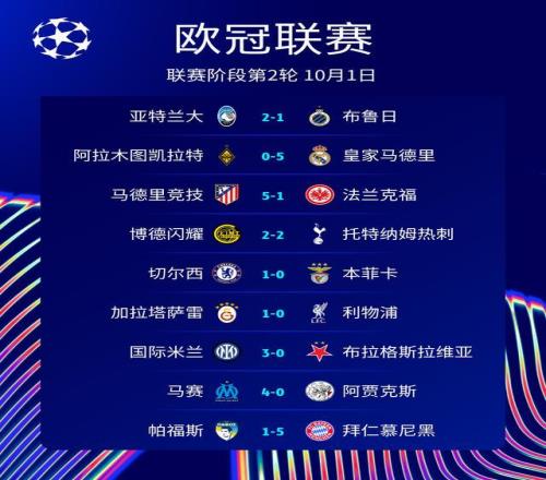 至此,本赛季欧冠联赛阶段第2轮首日的9场较量战罢,比赛结果为:亚特兰大2-1布鲁日、阿拉木图凯拉特0-5皇家马德里、马德里竞技5-1法兰克福、博德闪耀2-2托特纳姆热刺、切尔西1-0本菲卡、加拉塔萨雷1-0利物浦、国际米兰3-0布拉格斯拉维亚、马赛4-0阿贾克斯、帕福斯1-5拜仁慕尼黑。