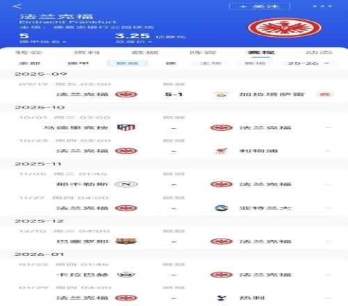 直播吧09月19日报道宣称 欧冠首轮比赛,法兰克福5-1大胜加拉塔萨雷,得以排在欧冠积分榜第1位。