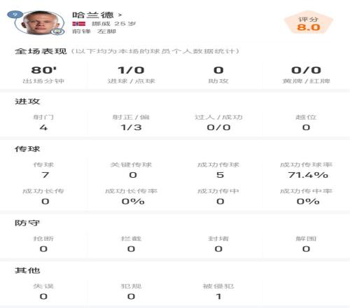 哈兰德对阵那不勒斯全场数据:4次射门1粒进球,解锁里程碑