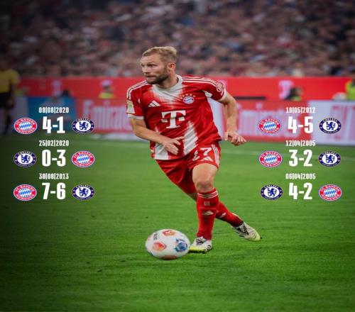 据统计,拜仁与切尔西历史近6次交手战绩为4胜2负,“南大王”略占上风。