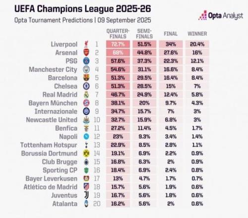 opta预测欧冠夺冠概率:利物浦20.4%居首,阿森纳次席,巴黎第三