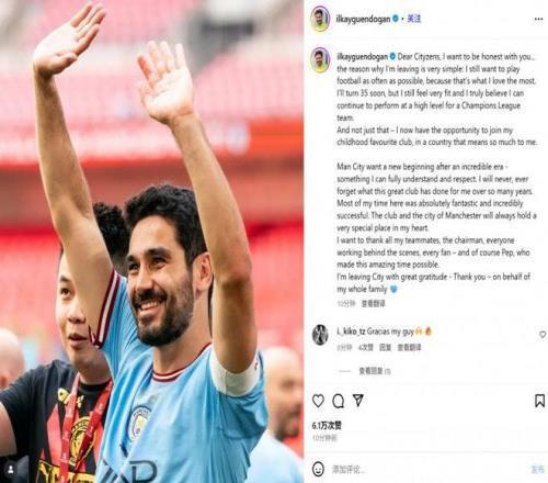 直播吧9月3日报道宣称 34岁的德国中场京多安已经官宣加盟加拉塔萨雷,他也通过社媒发布了向曼城的告别信: