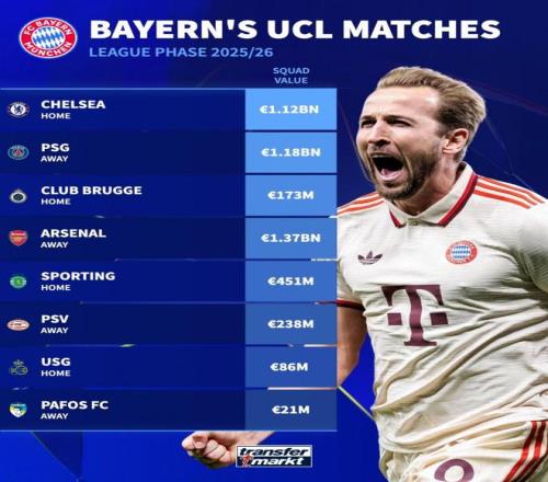 拜仁欧冠对手身价:阿森纳13.7亿欧最高,巴黎&蓝军超11亿欧