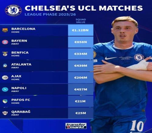 直播吧8月29日报道宣称 本赛季欧冠联赛阶段对阵抽签结果出炉,德国转会市场盘点了切尔西对手的身价。