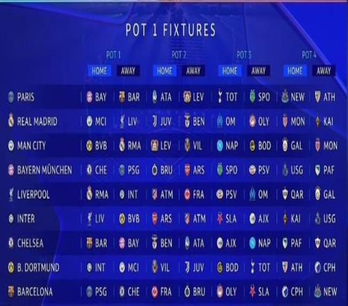 这是欧冠赛制改革后的第2个赛季,在全新的联赛阶段中,每支球队都将根据抽签从4个档位分别选出2个共计8个不同对手,进行4主4客共计8场比赛。