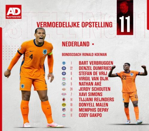 体育资讯7月10日报道宣称 北京时间明天凌晨,荷兰将在欧洲杯半决赛中对阵英格兰,荷兰媒体AD Sportwereld预测了两队的首发阵容。