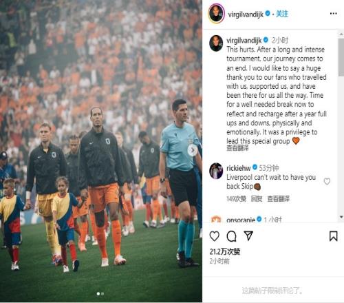 范迪克这样写道:“这让人很受伤,在一次漫长而激烈的锦标赛后,我们的旅程结束了。我想对与我们同行、支持并一直陪伴在我们身边的球迷表示衷心的感谢。”