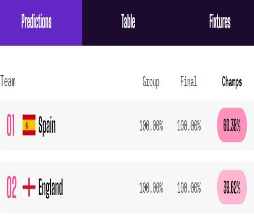 Opta超级计算机的预测结果显示,西班牙在决赛中夺冠的概率超过六成,达到了60.38%,而英格兰则不被看好,夺冠概率仅有39.62%。