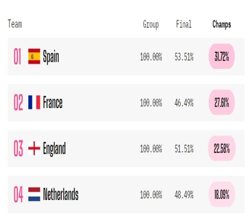 不看好三狮Opta欧洲杯最终预测:西班牙60%夺冠,英格兰不足40%