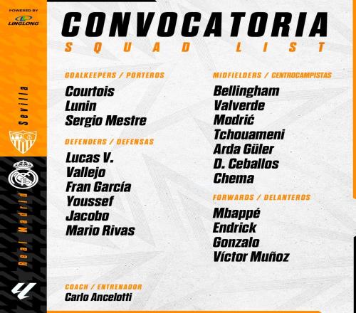 皇马客战塞维利亚名单:姆巴佩携多名小将出战,罗德里戈等人缺席