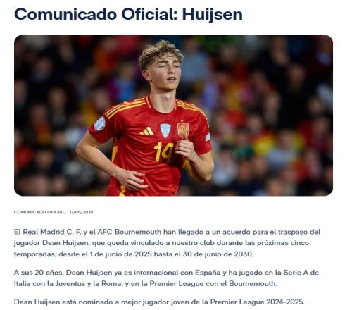 通过特批转会窗加盟!皇马官方确认:怀森6月1日加盟球队