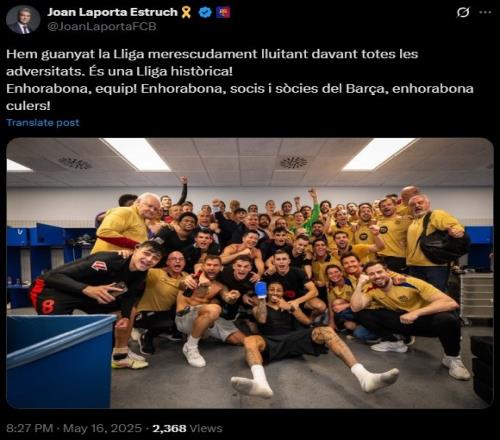 拉波尔塔写道:“我们当之无愧地赢得了联赛冠军,在重重逆境中奋力拼搏。这是一次历史性的夺冠!恭喜全队!恭喜巴萨的会员们,恭喜所有巴萨球迷!”