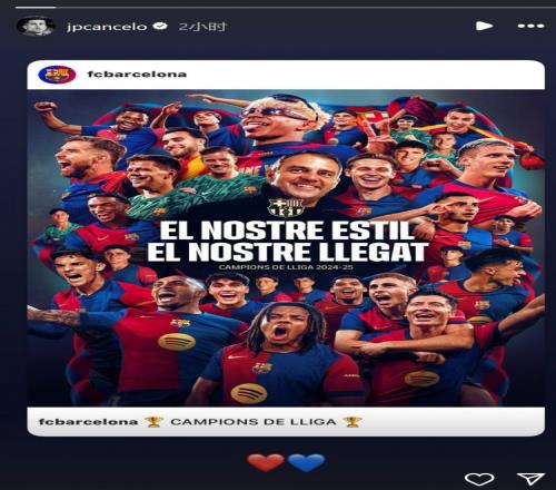 目前效力于利雅得新月的坎塞洛更新社媒动态,转发海报祝贺巴萨夺冠,并配上了红蓝心形表情符号。