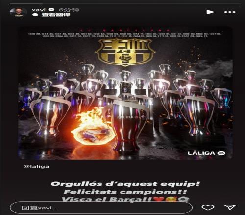 巴萨名宿、前任主帅哈维社媒转发夺冠海报,配文:“为这支球队感到骄傲,祝贺冠军们!巴萨万岁!”