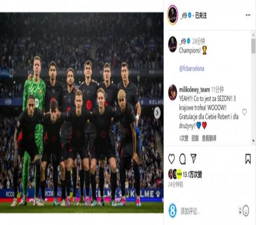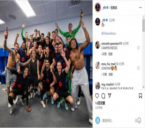 巴萨前锋莱万社媒晒出球队首发阵容的照片,以及赛后更衣室的合照,庆祝球队夺冠,配文:“冠军!”