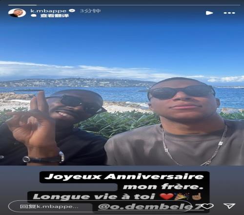 姆巴佩社媒晒出与登贝莱的合照,配文:“生日快乐,我的兄弟,祝你长命百岁!”