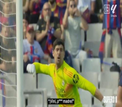 下半场,维尼修斯从德容手里夺过皮球,快开任意球,结果直接传给了亚马尔。随后亚马尔禁区前打出一脚极具威胁的远射,库尔图瓦扑救之后,挥拳怒吼维尼修斯“狗娘养的!”(puta madre)