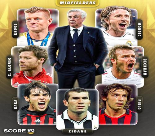 中场:克罗斯、哈维-阿隆索、卡卡、齐达内、皮尔洛、贝克汉姆、莫德里奇