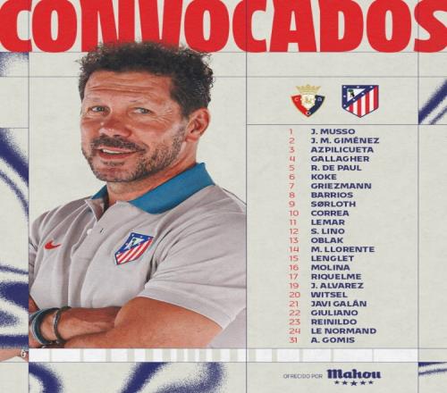 马竞客战奥萨苏纳大名单:阿尔瓦雷斯领衔锋线,德保罗坐镇中场