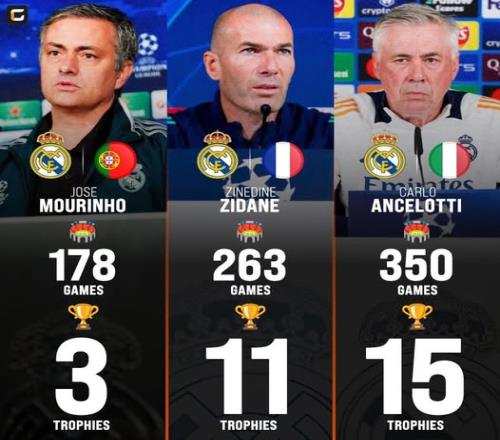 三代名帅穆帅带皇马178场3冠,齐祖263场11冠,安帅350场15冠