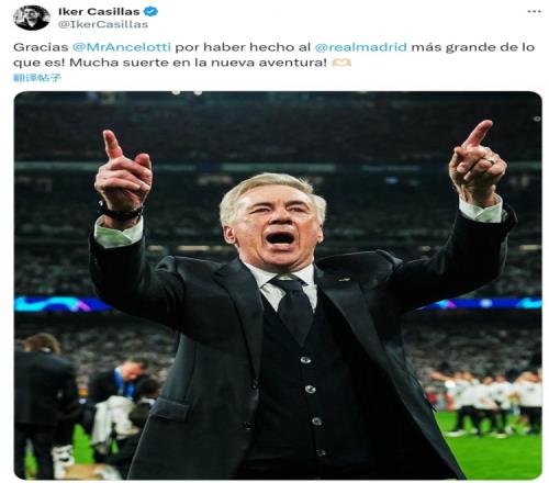 体育资讯5月14日报道宣称 皇马主帅安切洛蒂将离任,接手巴西国家队,皇马名宿卡西利亚斯社媒发文,为安帅送上祝福。