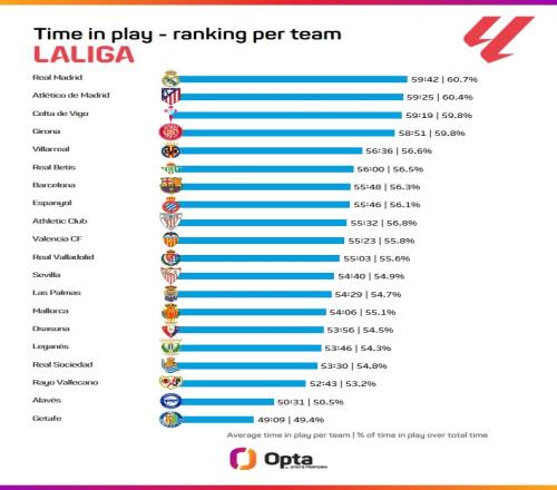体育资讯5月13日报道宣称 西甲第35轮比赛战罢,Opta统计了各队本赛季的场均净时间,并列出名单,皇马59分42秒居首,巴萨排名第7位。