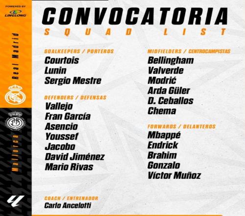 皇马公布战马洛卡名单:罗德里戈缺席,多名青训小将在列