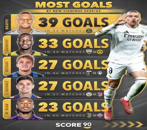 本赛季五大联赛新援进球榜:姆巴佩39球居首,吉拉西33球次席