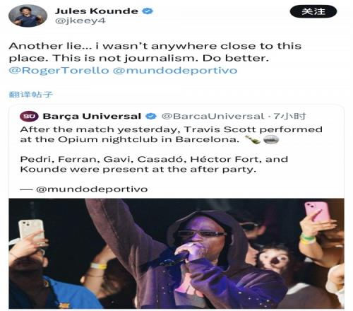 据悉,有媒体报道称孔德在比赛日之后前往巴萨当地的夜店,因为Travis Scott在那里进行了演出。但孔德本人对此予以否认。