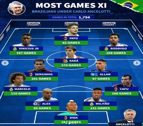 体育资讯5月12日报道宣称 安切洛蒂将正式执教巴西国家队,德转也盘点了安切洛蒂执教生涯中,在其治下巴西球员出场次数最多阵容,具体如下:
